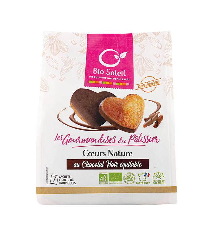 Œufs entiers* ; beurre* (25%) ; sucre de canne roux équitable* ; chocolat noir équitable* (18%) (pâte de cacao*, sucre de canne*, beurre de cacao*, extrait de vanille*) ; farine de blé T65* ; sucre inverti* ; arôme naturel de vanille* (alcool*, vanille*) ; épaississant : gomme d’acacia* ; poudres à lever (bitartrate de potassium, bicarbonate de sodium) ; sel de mer non raffiné.